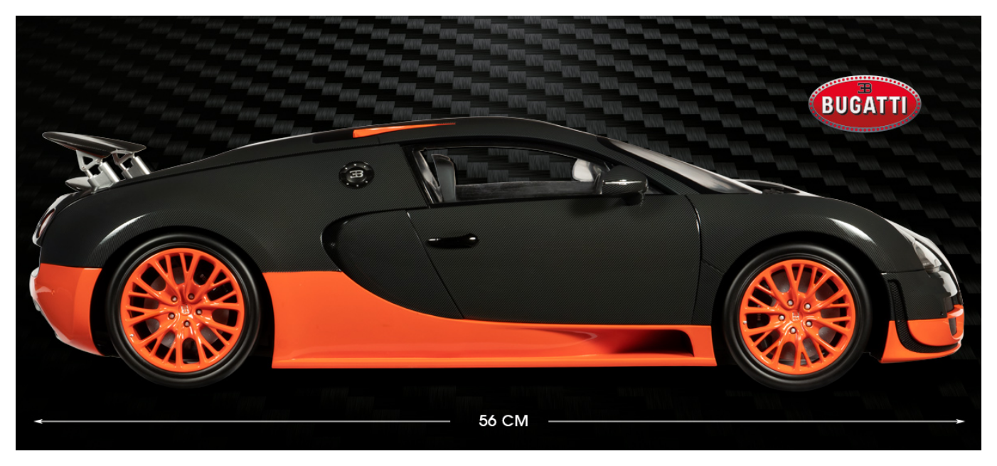 Une voiture très exclusive qui s’invite désormais dans votre salon. Souvent proposée à l’échelle 1/43e (comme les voitures de la collection American Cars d’Altaya) ou au 1/18e (collection voitures de rallye d’Altaya), la Bugatti Veyron 16.4 Super Sport arrive désormais à l’échelle 1/8e ! Une échelle très imposante. Pour preuve, cette « miniature » va mesurer 56cms de long !