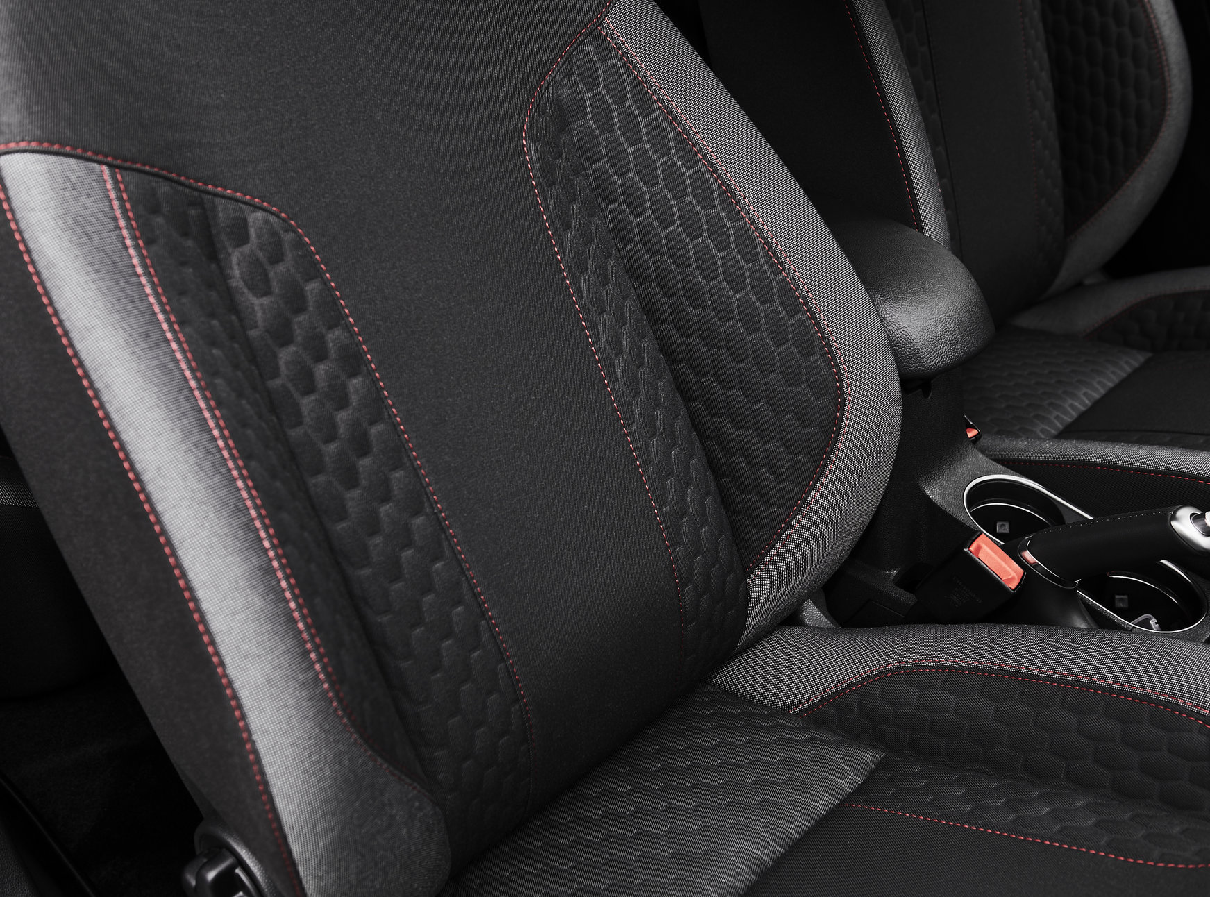 - Des sièges Sport avec surpiqûres rouges et un volant en cuir perforé typé ST avec surpiqûres grises