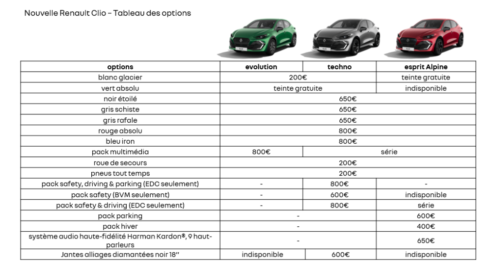 Pour finir, voici le tableau complet des différentes options, partagé par Renault, via un communiqué officiel.