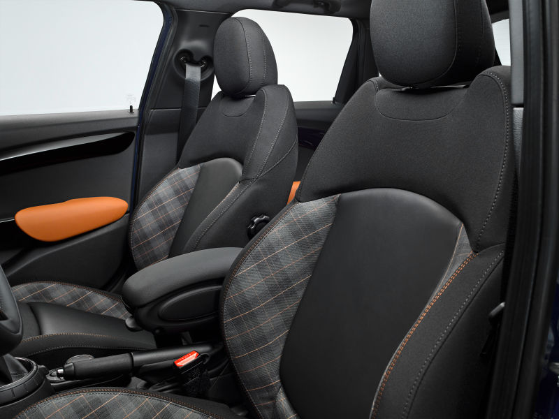 Nous pouvons aussi évoquer, dans l’habitacle, la sellerie, savant mélange de tissu et de cuir, ainsi que la planche de bord, agrémentée d’inserts marron laqué, élégamment baptisé « Diamond Malt Brown ». Le logo Mini Seven est également présent à l’intérieur de cette édition spéciale puisque les seuils de portes et le cerclage de l’instrument centrale en profitent. Un petit mot aussi sur l’aspect connecté de cette Mini Seven, avec le fameux Mini Connected comprenant les applications Streetwise. Au programme, recherche « online », services en ligne permettant d’accéder aux réseaux sociaux et aux contenus de divertissement. Notons enfin la présence du système inforoute en temps réel (RTTI) ainsi que la touche d’ appel d’urgence désormais totalement démocratisée, ainsi qu’un téléservice faisant usage de la carte SIM intégrée dans la belle.