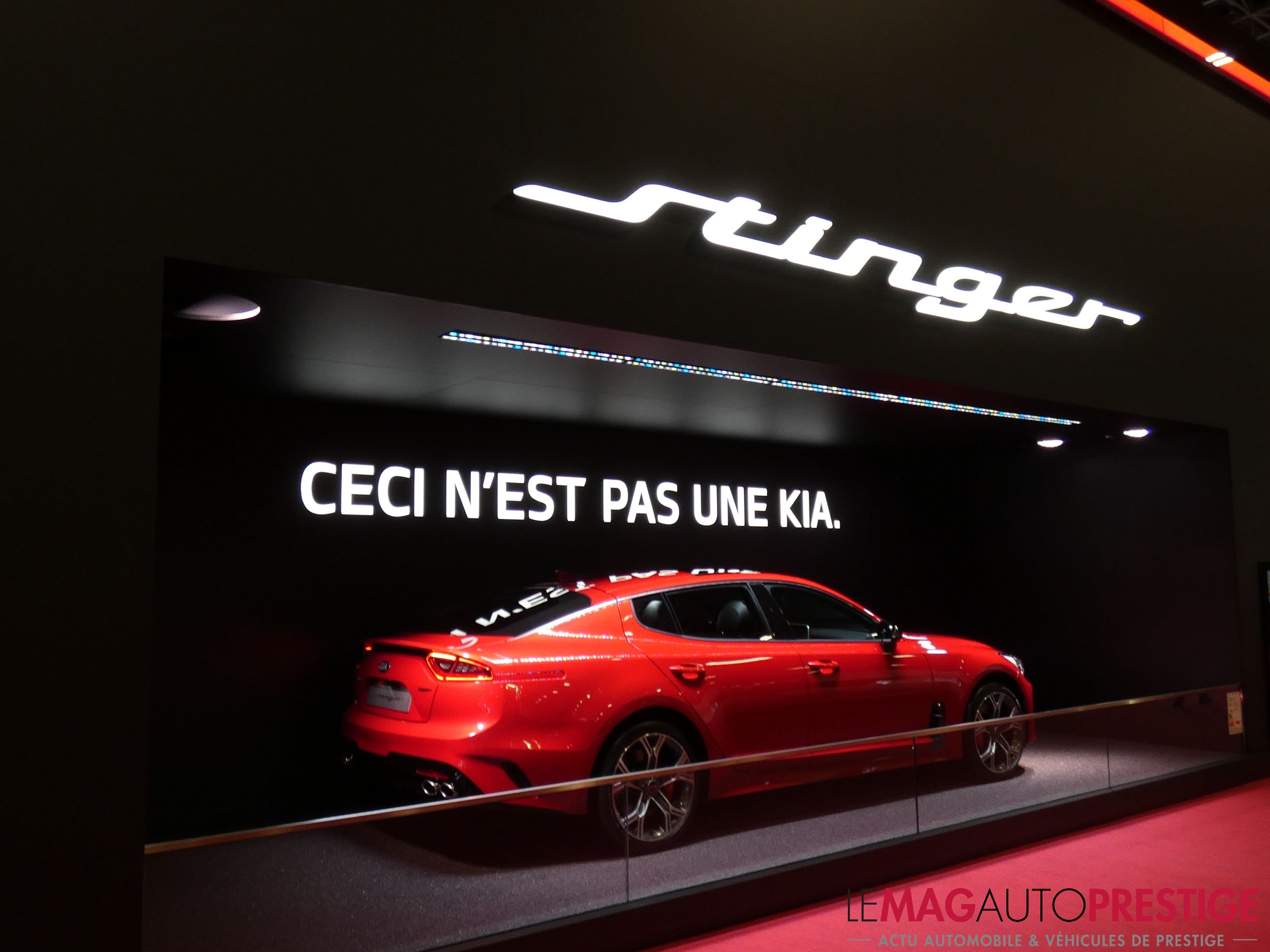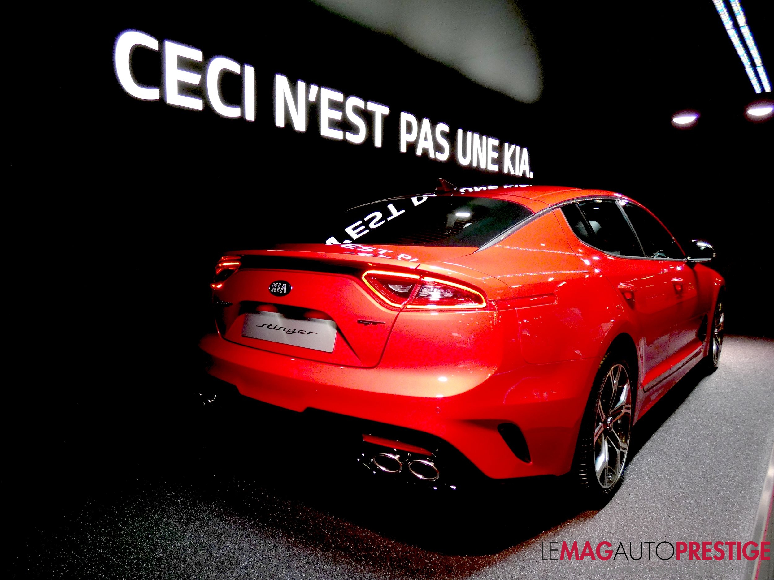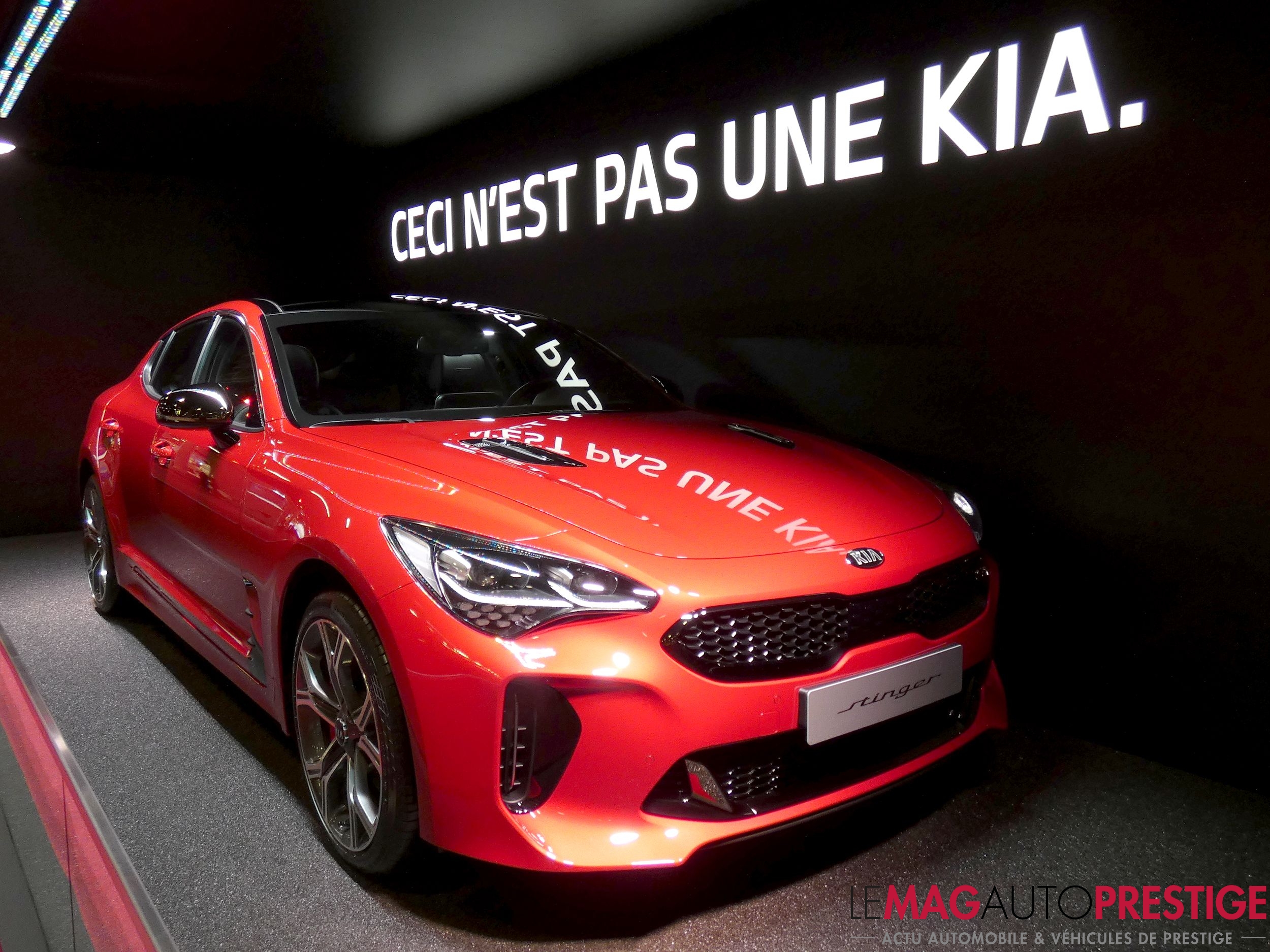 Kia est une marque sud-coréenne surtout connue pour ses petites citadines garanties 7 ans. Ainsi, au Mondial de l’Auto 2018, la marque aux trois lettres faisait preuves d’autodérision pour mettre en avant sa Stinger version 2018. Avec une alcôve entièrement dédiée et nommée « Ceci n’est pas une Kia« , il y avait de quoi attirer.