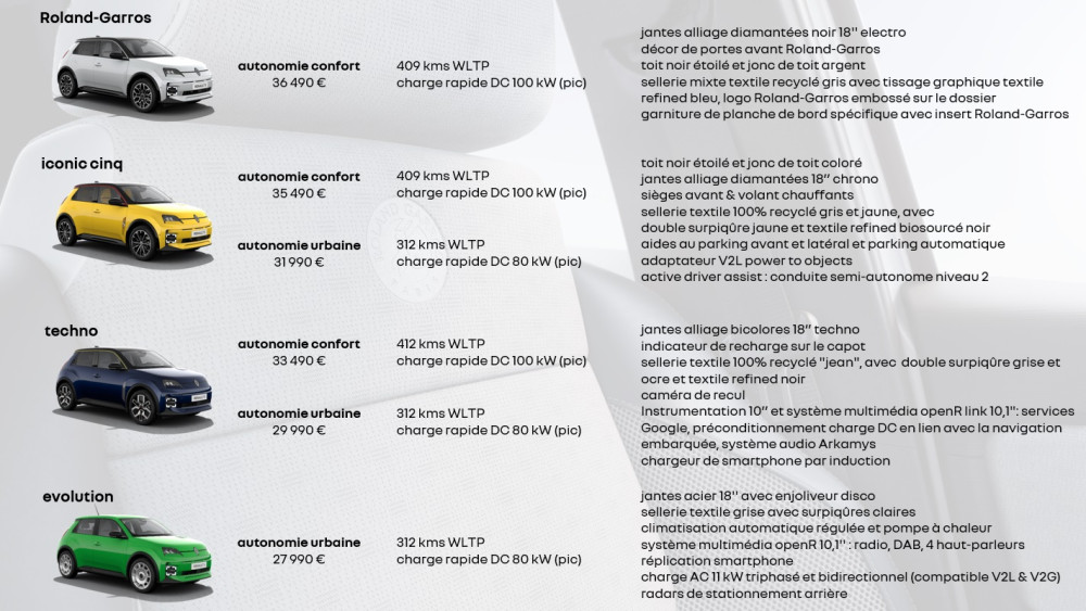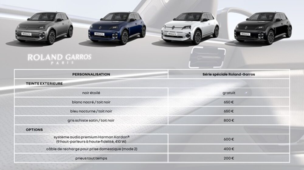 A savoir enfin, les détenteurs du coupe-file R5 Roland-Garros R Pass auront la priorité sur les commandes. Ils seront aussi les premiers à être livrés. Pour finir, voici les détails des versions, options et tarifications de cette Renault 5 édition spéciale ainsi que ses petites soeurs.