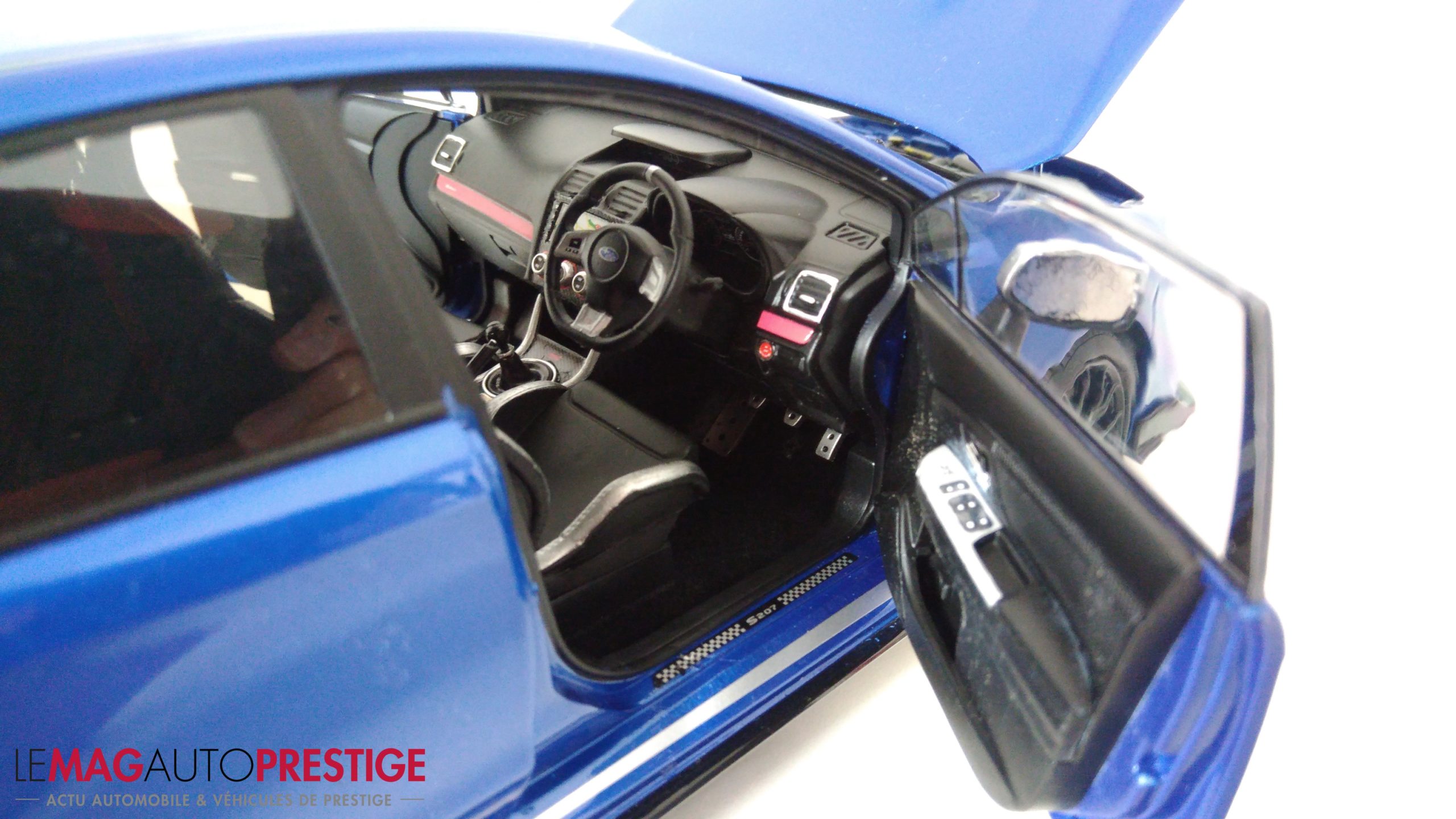 Sous le capot, le moteur a également le droit à un bon niveau de détails. Certes, ce n’est pas du AutoArt, mais c’est sûrement ce qui se fait de mieux à moins de 100€. L’intérieur est plutôt bon également et le tableau de bord bénéficie d’un certain soin. Le magnifique aileron arrière, comme sur la voiture à l’échelle 1 :1, parachève le magnifique résultat. Il donne tout son caractère à cette miniature comme il renforce l’aspect « méchant » de la voiture de chez Subaru.